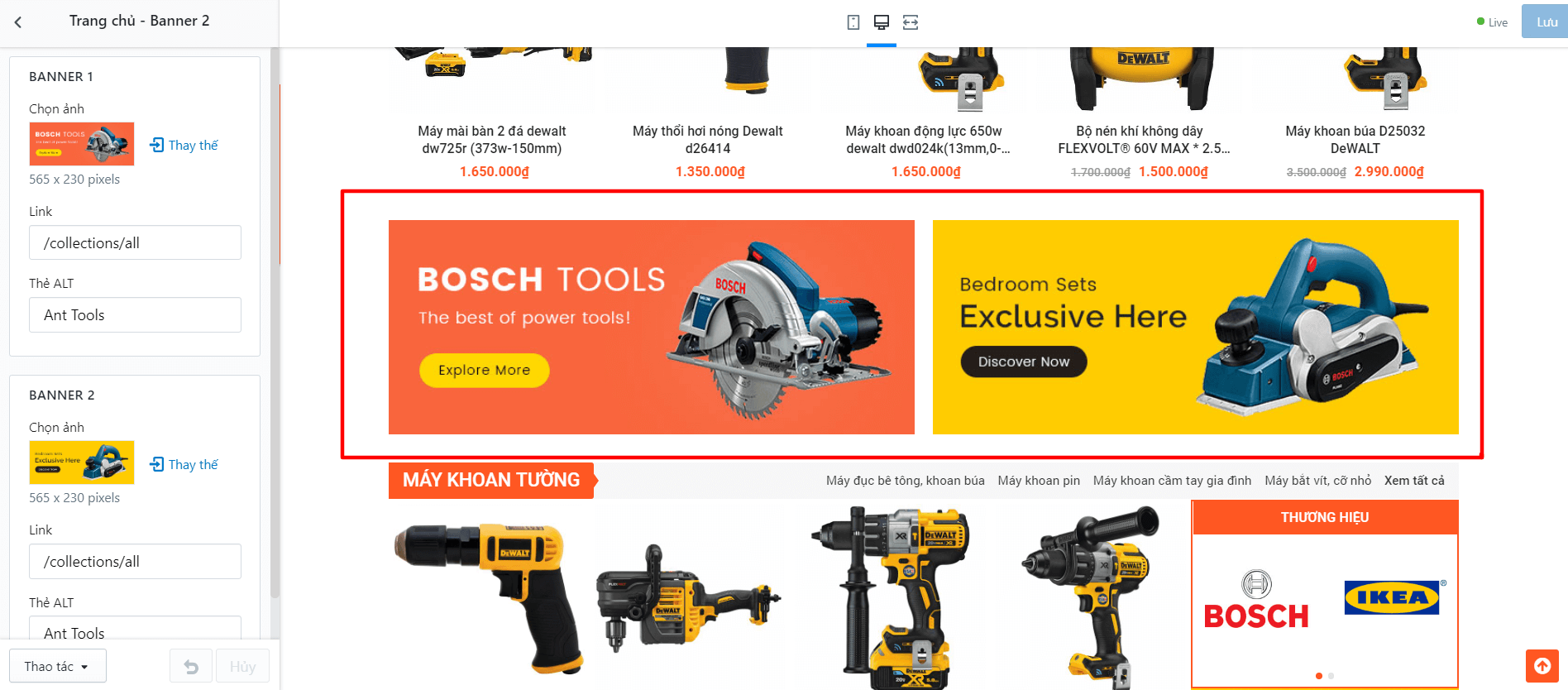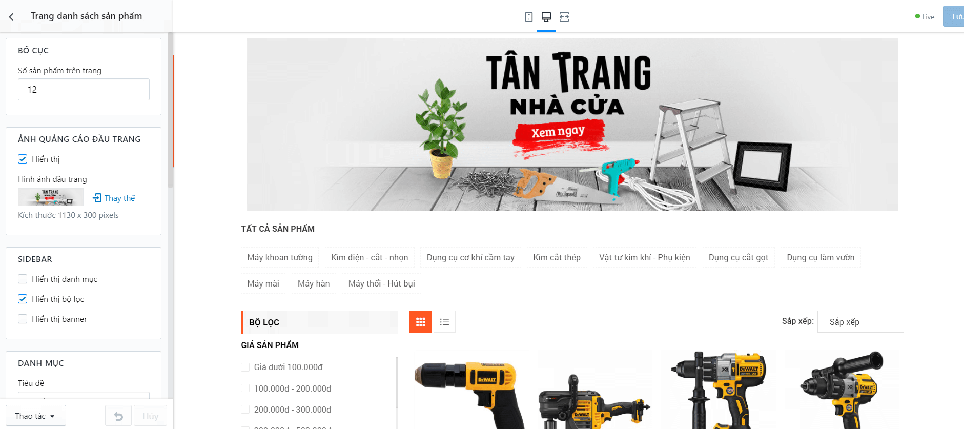 Mục Trang danh sách sản phẩm thiết lập danh mục sản phẩm, banner quảng cáo và số lượng sản phẩm hiển thị.
