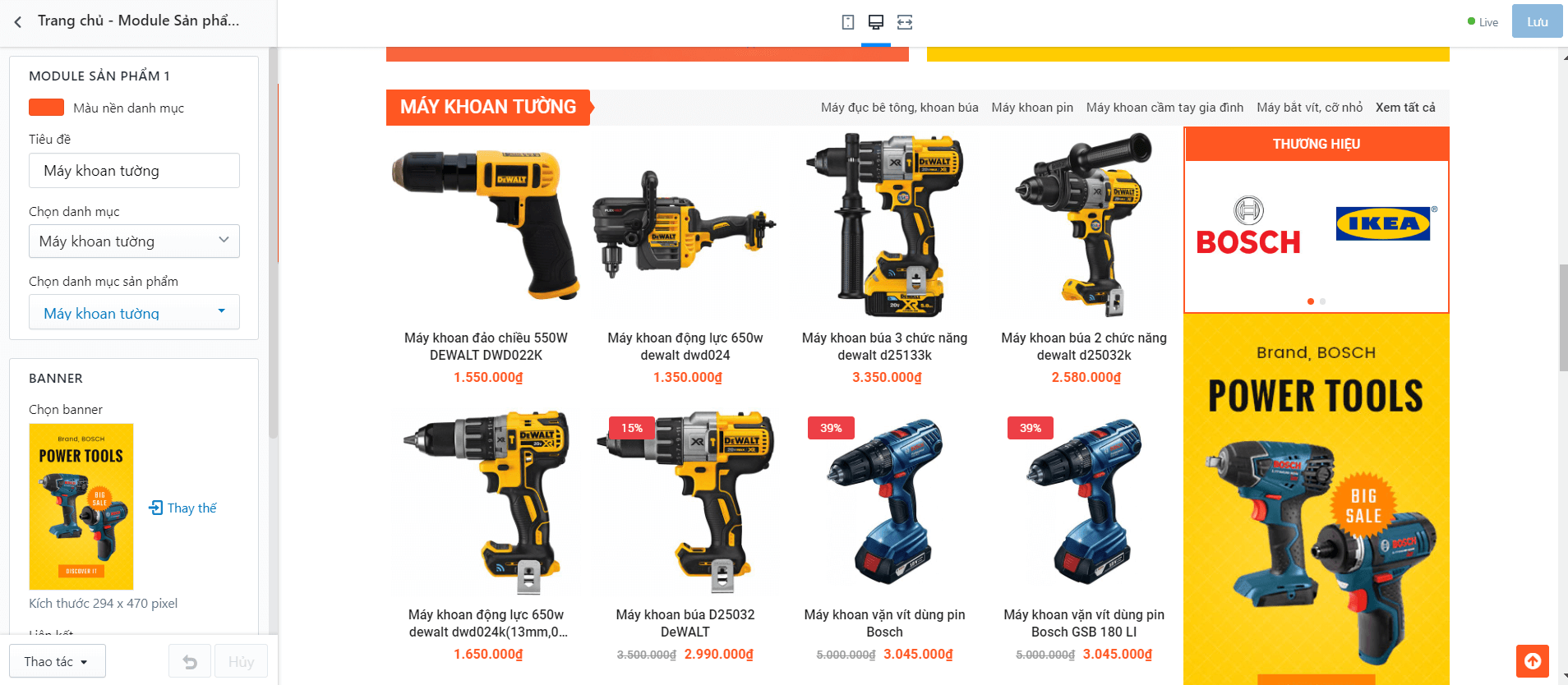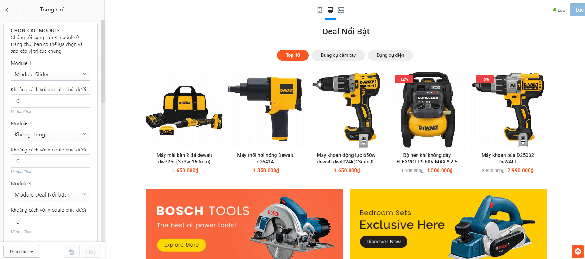 Mục Trang chủ - odule sản phẩm 1 và 2 thiết lập tiêu đề, url, danh mục sản phẩm, giới hạn số sản phẩm muốn hiển thị.