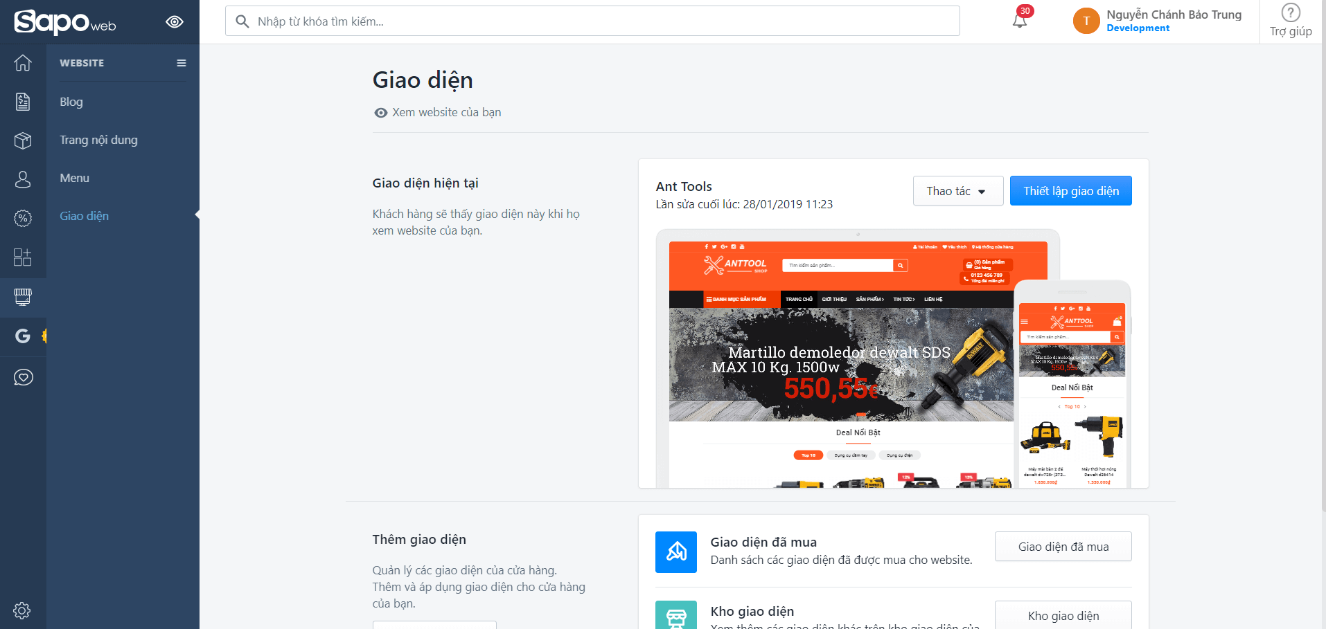 Sau khi cài đặt theme mới lên cửa hàng, bạn bấm vào THIẾT LẬP GIAO DIỆN để tùy chỉnh theme: