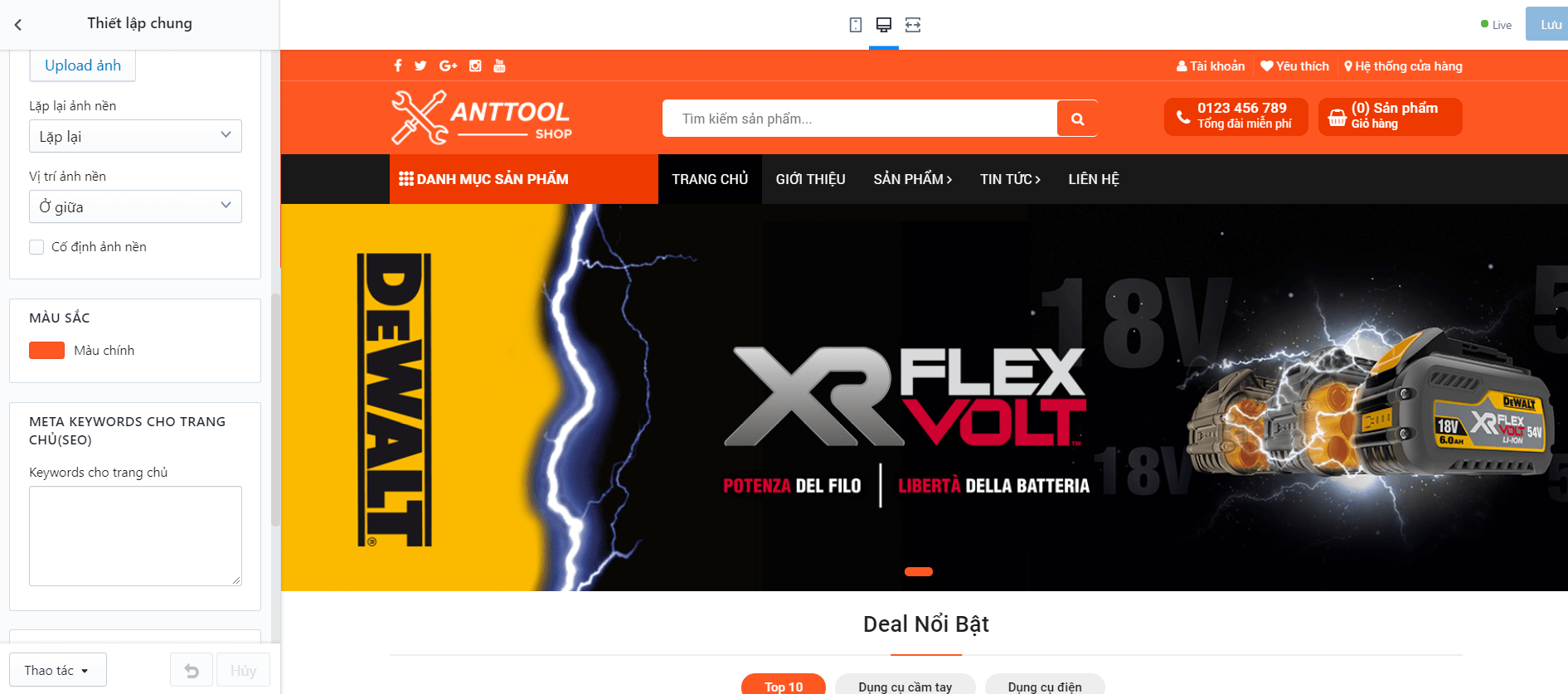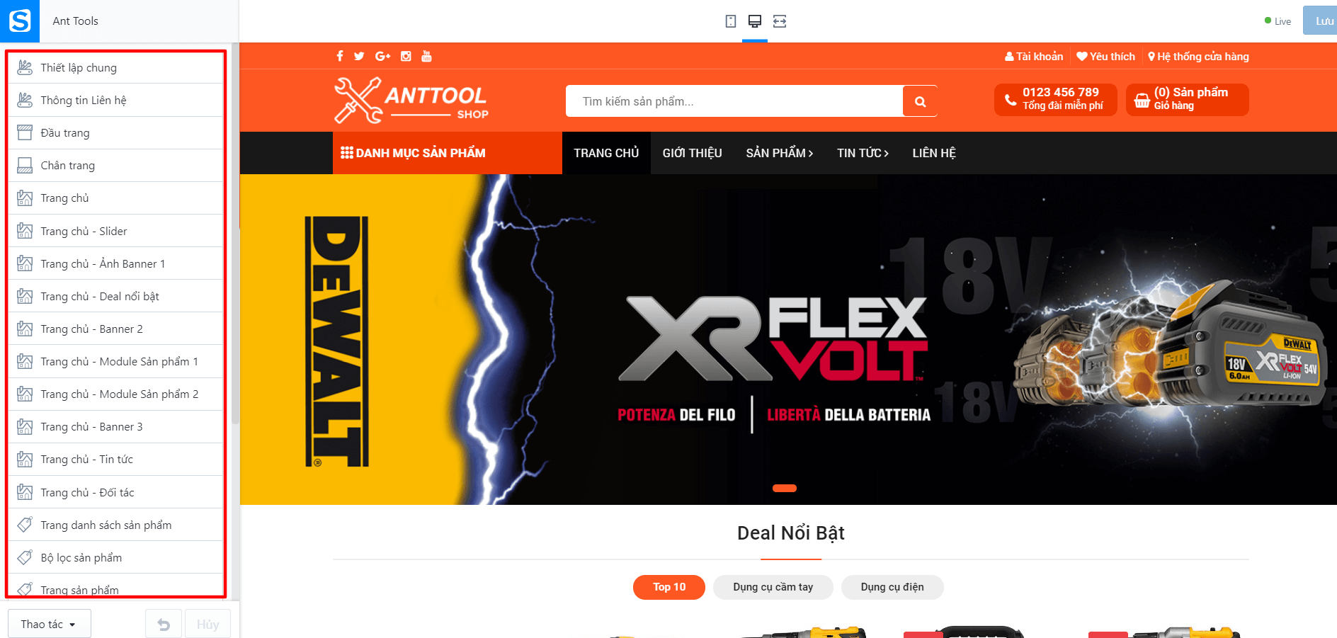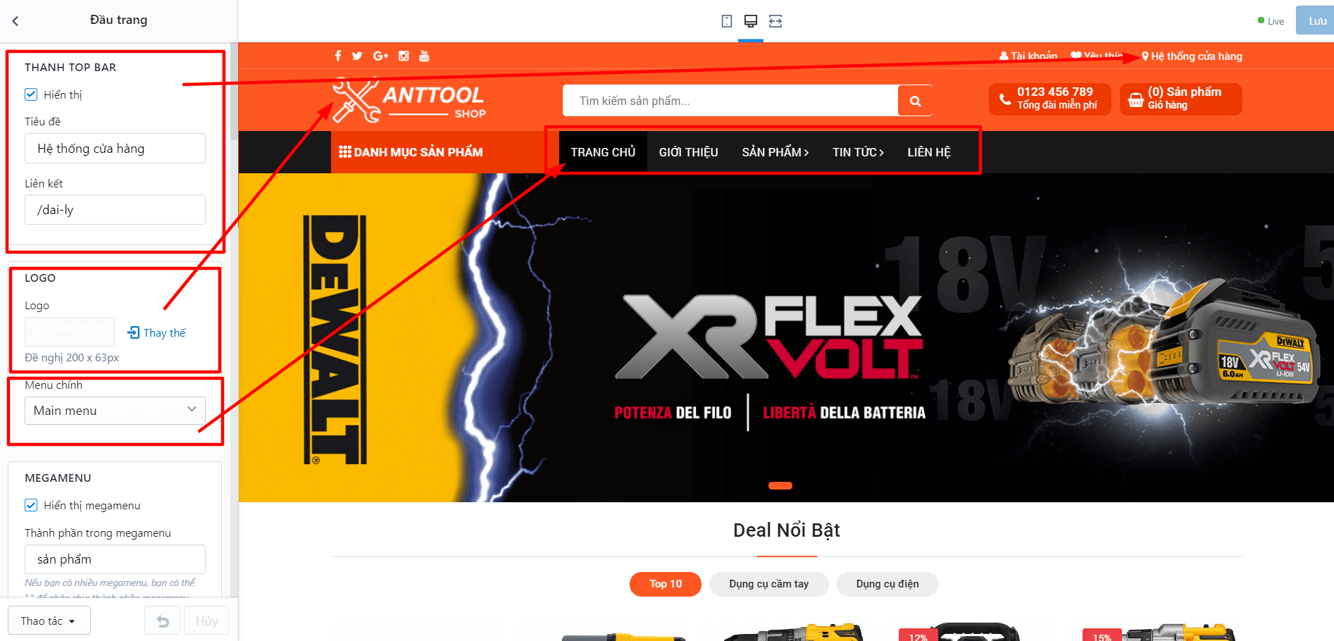 Mục ĐẦU TRANG chứa các phần thiết lập Menu chínhnh, các liên kết, thông tin cơ bản, dịch vụ của cửa hàng.