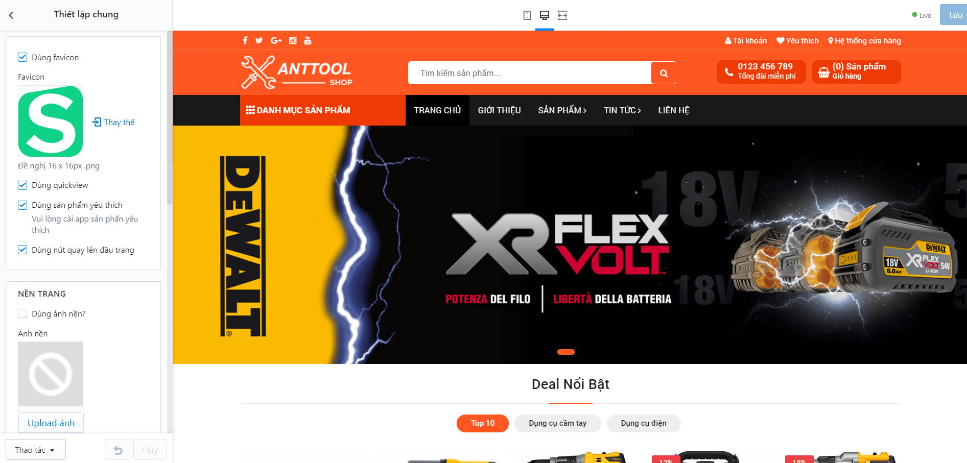 Mục THIẾT LẬP CHUNGchứa các phần thiết lập cơ bản như logo, thông tin shop, cài đặt phông chữ, màu sắc toàn trang.
