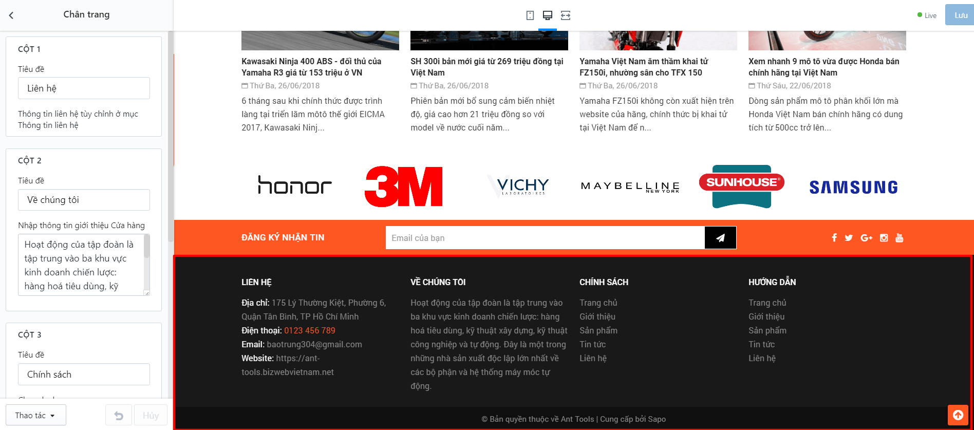 Mục CHÂN TRANG chứa các phần thiết lập menu chân trang, các khối bổ sung như Mạng xã hội, Các khối menu