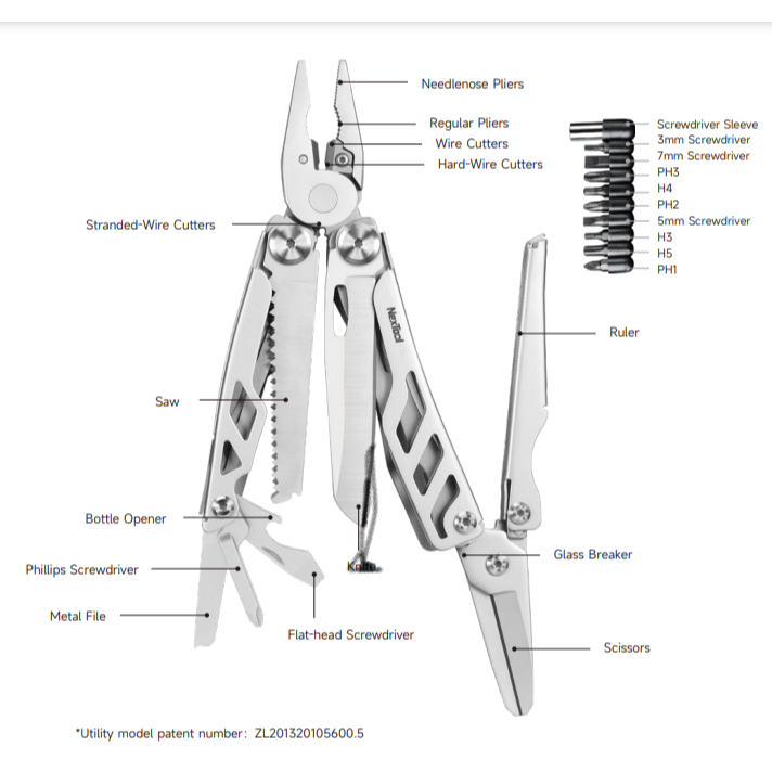 NEXTOOL FLAGSHIP PRO MULTITOOL KÌM ĐA NĂNG NE20203 Gói bao gồm: Flagship Pro × 1, Túi × 1, Hướng dẫn sử dụng × 1 Kích thước: 110 × 40 × 21,5mm (đã đóng) Tài liệu chính: 30CR13 Vật liệu lưỡi: 5CR15MOV Trọng lượng: 245g ± 5g 16 trong 1 Bộ công cụ đa năng: Nút mũi và kìm thường xuyên, máy cắt dây YG8, kéo (kích thước đầy đủ), da0, cưa, Phillips & tuốc nơ vít phẳng, thước kẻ, chai & có thể mở, máy cắt đường dây, dây thoát y, máy cắt thủy tinh và làm bằng thép không gỉ cứng với độ cứng và độ cứng, chống gỉ. Main Body Material: 420 Stainless Steel Plier Material: 30Cr13 Stainless Steel Knife Material: 50Cr15MoV Stainless Steel Finish: Tumbling for Clip, Sand Blasted for other components Closed Size: 110x40x21mm N.Weight: 245±5g Needle Nose Plier, Standard Plier, Wire Cutter, Hard Wire Cutter, Thick Wire Cutter, Wood Saw, Knife, Flathead Screw Driver, Bottle Opener, Spoke Wrench, Spanner, Belt Cutter, Phillips Screw Driver, Ruler, Glass Breaker, Scissors