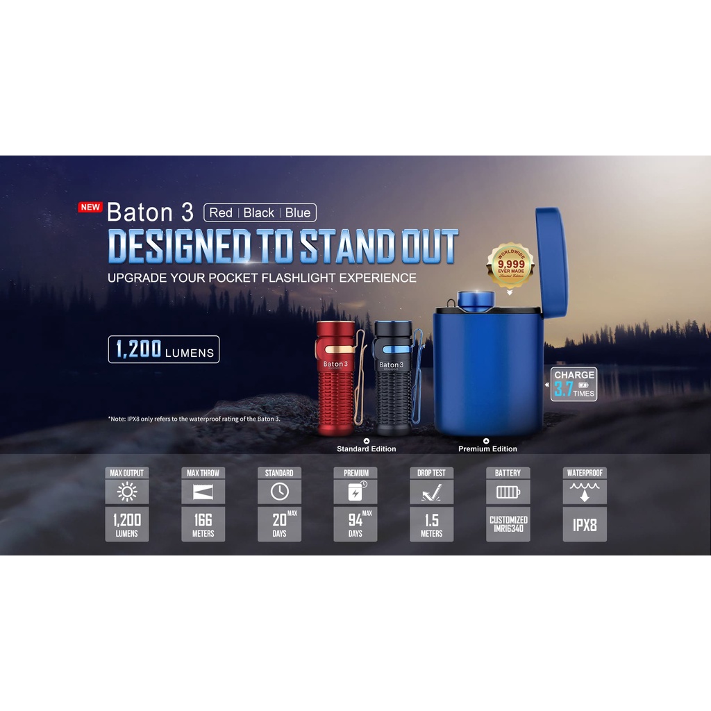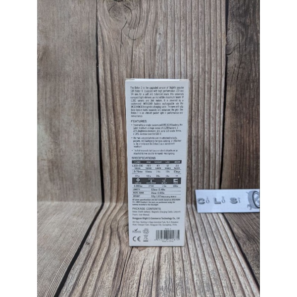 THÔNG SỐ KỸ THUẬT Sử dụng bóng LED CW. Độ sáng tối đa 1200 lumens, chiếu xa 166m. Thấu kính TIR cho quầng sáng rộng và đẹp. Sử dụng pin sạc 550mAh IMR16340. Cho thời lượng sáng tối đa lên đến 20 ngày ở chế độ sáng thấp nhất. Sạc nhanh qua đuôi nam châm MCC 1A. Điều khiển bằng 1 công tắc bên hông. Thân đèn được tiện phay các rãnh tăng ma sát cầm nắm. Chống nước và bụi tiêu chuẩn IPX8. Có đèn hiển thị mức pin. Mức sáng Mức 1 : 1,200~300 (lumens) – 1.5+75 phút Mức 2 : 300 (lumens) – 95 phút Mức 3 : 60 (lumens) – 7.5 giờ Mức 4 : 12 (lumens) – 33 giờ Mức 5 : 0.5(lumens) – 20 ngày Strobe : có --- Cổ Lỗ Sĩ O96336924O Chungcư 54 HạĐình, HạĐình, TX, Hànội WEBSlTE: colosi. com. vn